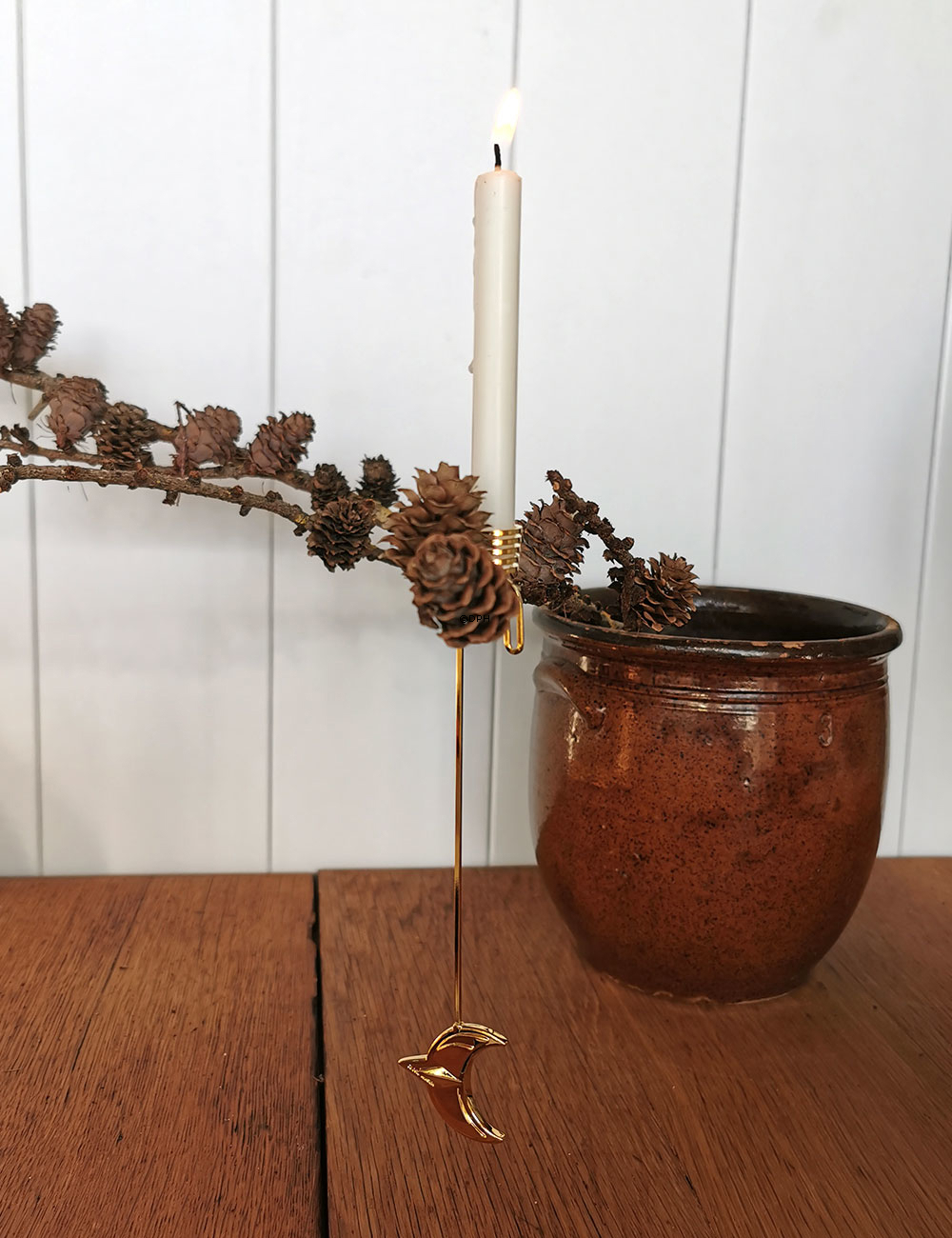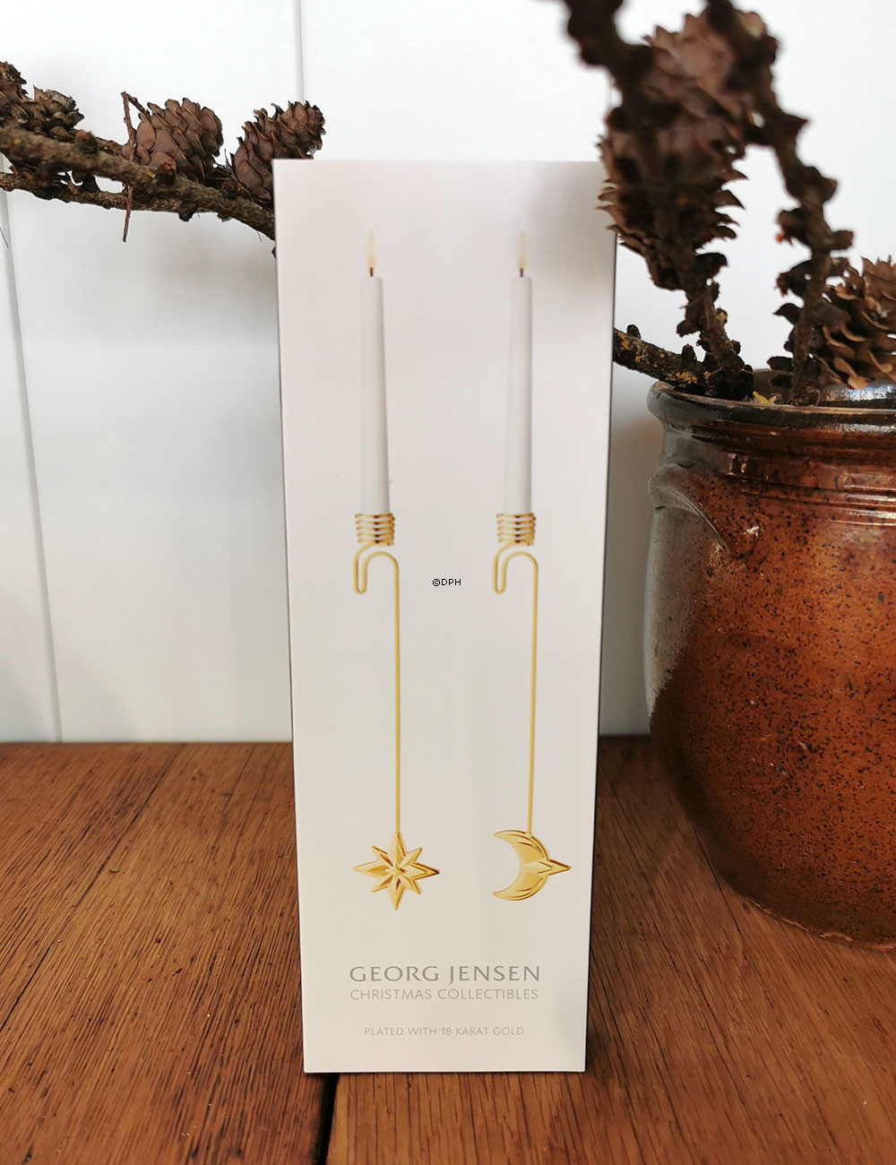 Georg Jensen Christmas Candleholder set 2024 with motif of Star and Moon, designed by Sanne Lund Traberg. Finish: 18 kt. gold plated zinc alloy