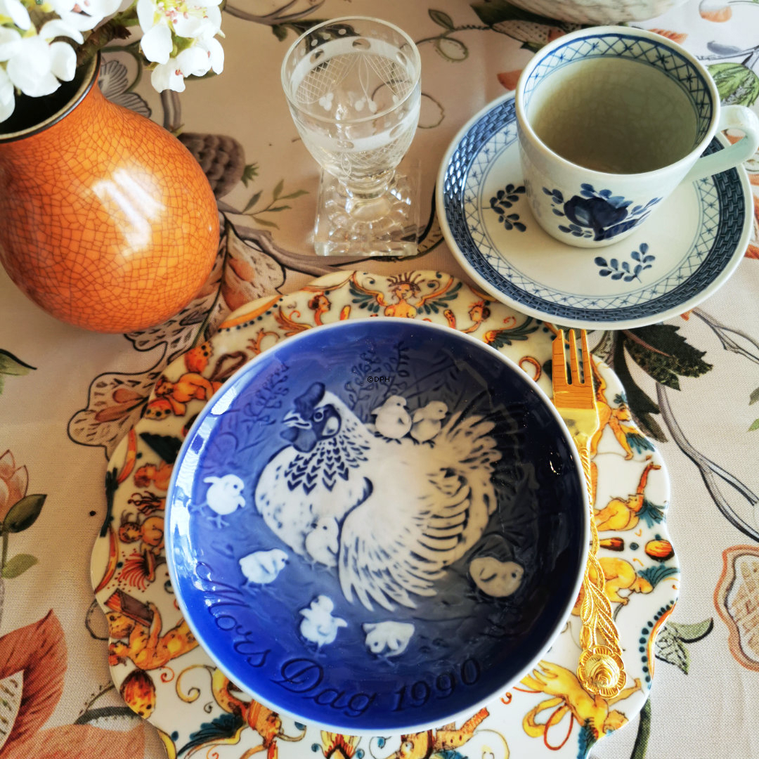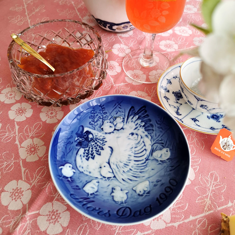1990 Bing & Grondahl Mother's Day plate with the title Hen with Chicken was designed by Leif Ragn Jensen The motif of the 1990 Bing & Grondahl Mothers Day plate shows a hen with her chicken. The first couple of weeks after the birth the chicken need warm from their mother. When the hen is going to teach the chicken about food she cluck and prick in the soil. The Bing & Grondahl Mothers Day plates were started in 1969 and are still being continued with a new Mother's Day plate every year.