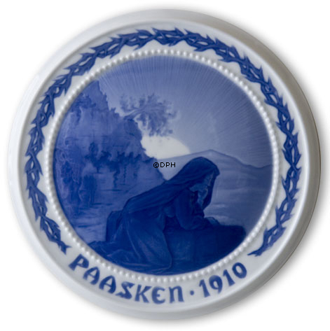 1910 Bing & Grondahl Easter plate with the title Mary Magdalene at the Tomb was designed by the famous Danish designer Dahl Jensen. The technique used for this 1910 Bing & Grondahl Easter plate is underglaze.