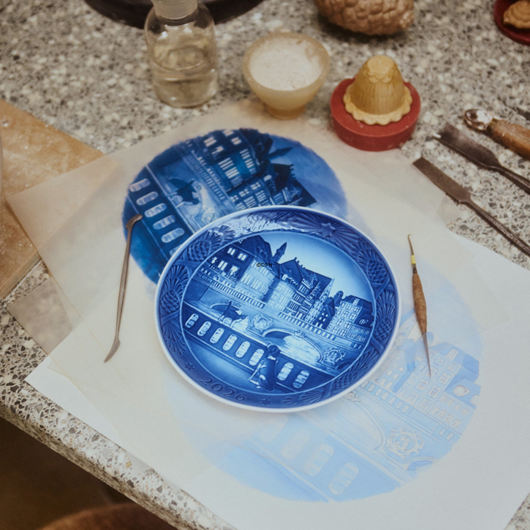 The Marble Bridge over Frederiksholm Canal is one of ten bridges that connect Christiansborg Palace on Slotsholmen in Copenhagen with the rest of the city. The bridge was built between 1739 and 1745. On this year's Christmas plate from Royal Copenhagen, the bridge is shown with the beautiful, impressive buildings in the background. The bridge is observed by a sweet dog and a curious cat, who is balancing along the railing while the dog watches with interest.