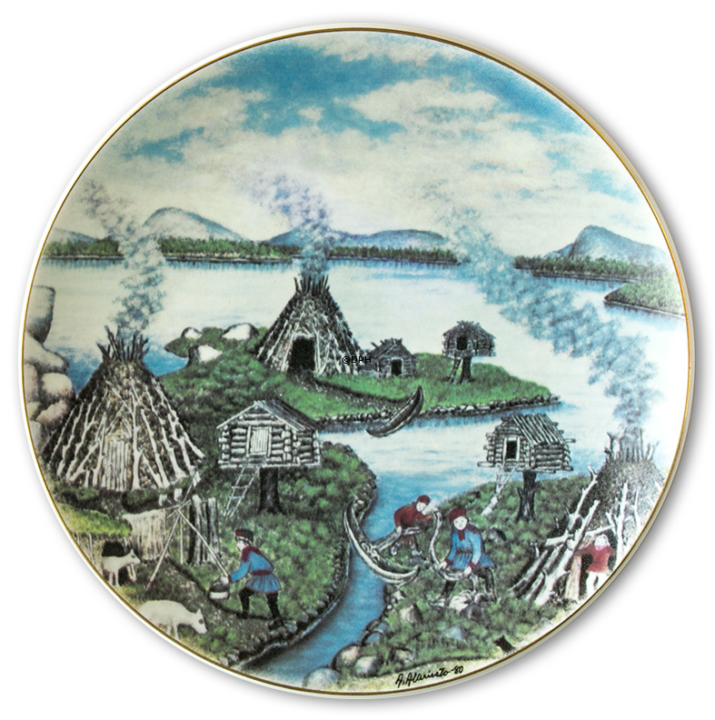 Large Arabia Artist plate 1980 with the title "Lappland cottages". This series depicts motifs from Andreas Alariesto's pictures of Lapland. The plate is produced in a limited edition of 7000 pieces.